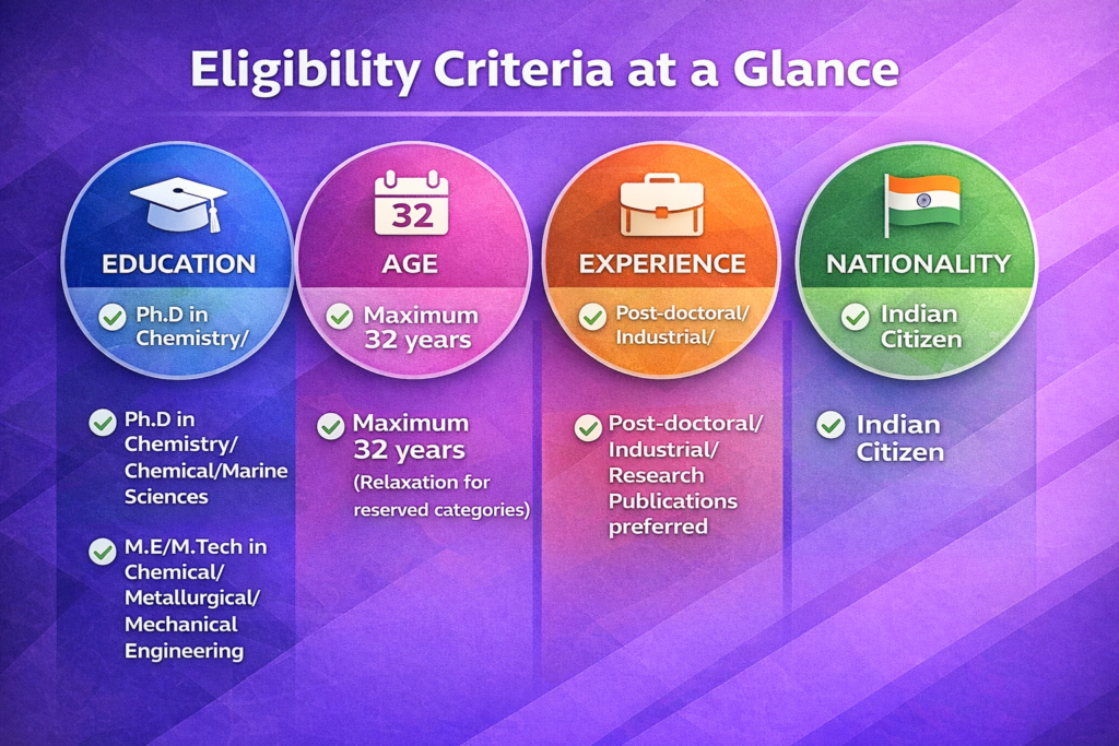 - Qualification: Ph.D (Submitted) in Chemistry/Chemical Sciences/Marine Biology/Sciences OR M.E/M.Tech in Chemical/Metallurgical/Material Science/Thermal/Mechanical Engineering